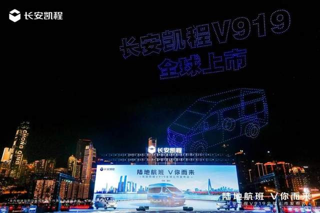 精彩震撼的无人机表演点亮夜空,与山城魅力交相辉映,V919承载着长安凯程战略转型的使命与万千消费者的创富热情,与用户扬帆启航。